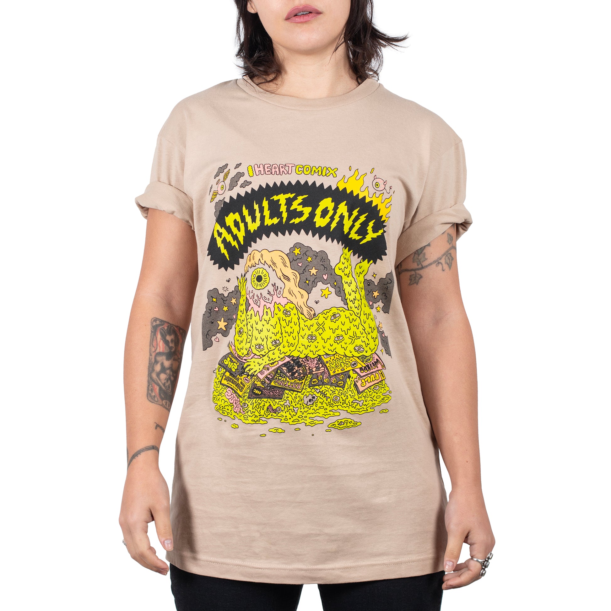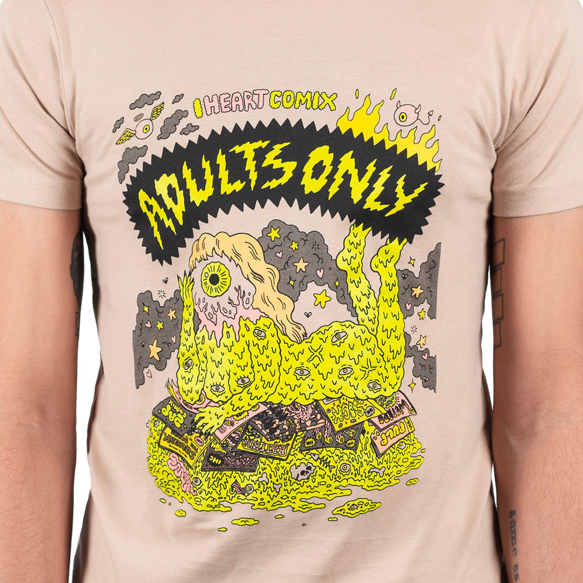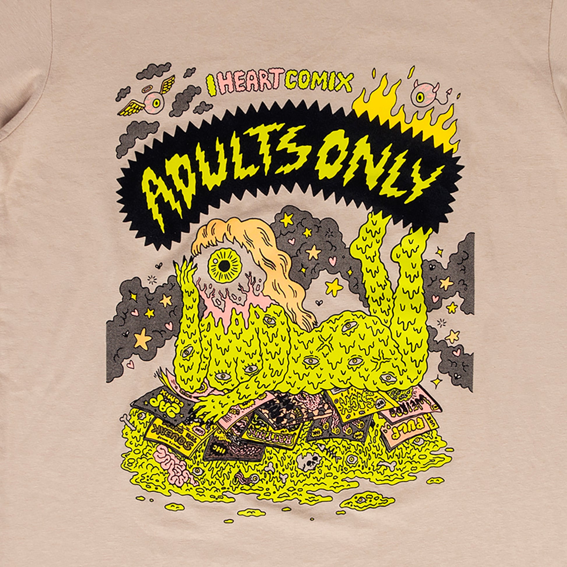 She brings her unforgettable and disturbing style as an official exclusive to IHEARTCOMIX with the "Adults Only" design! Featuring some of our most beloved past times (reading comics), it’s depicted in way only she can, as the sickest.