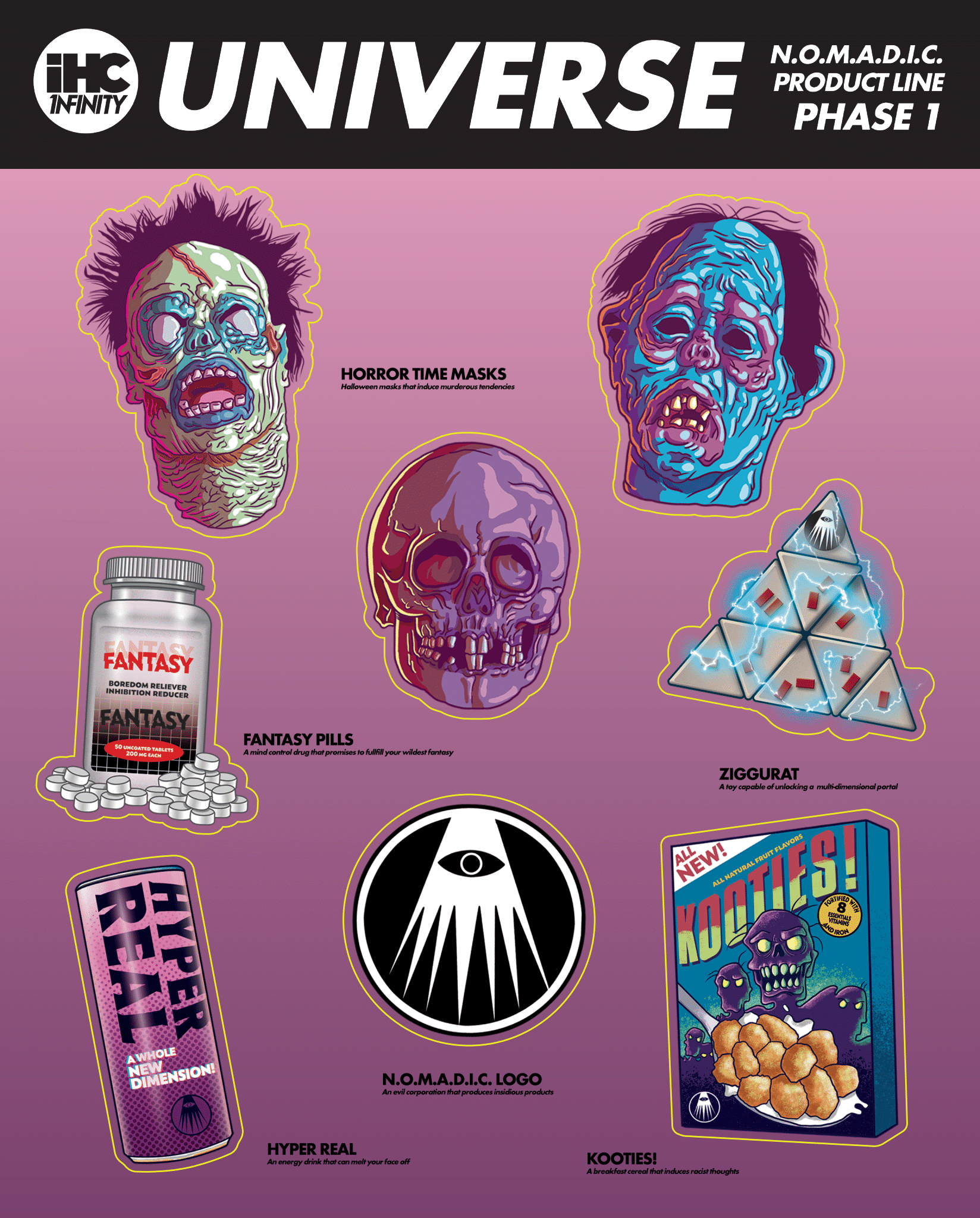 Explore the nefarious products of the IHC 1NFINITY Universe with the N.O.M.A.D.I.C Product Line Phase 1 stickers! This collection showcases some of the items made by the 'bad guys' from our shared music video universe! Collect them all!